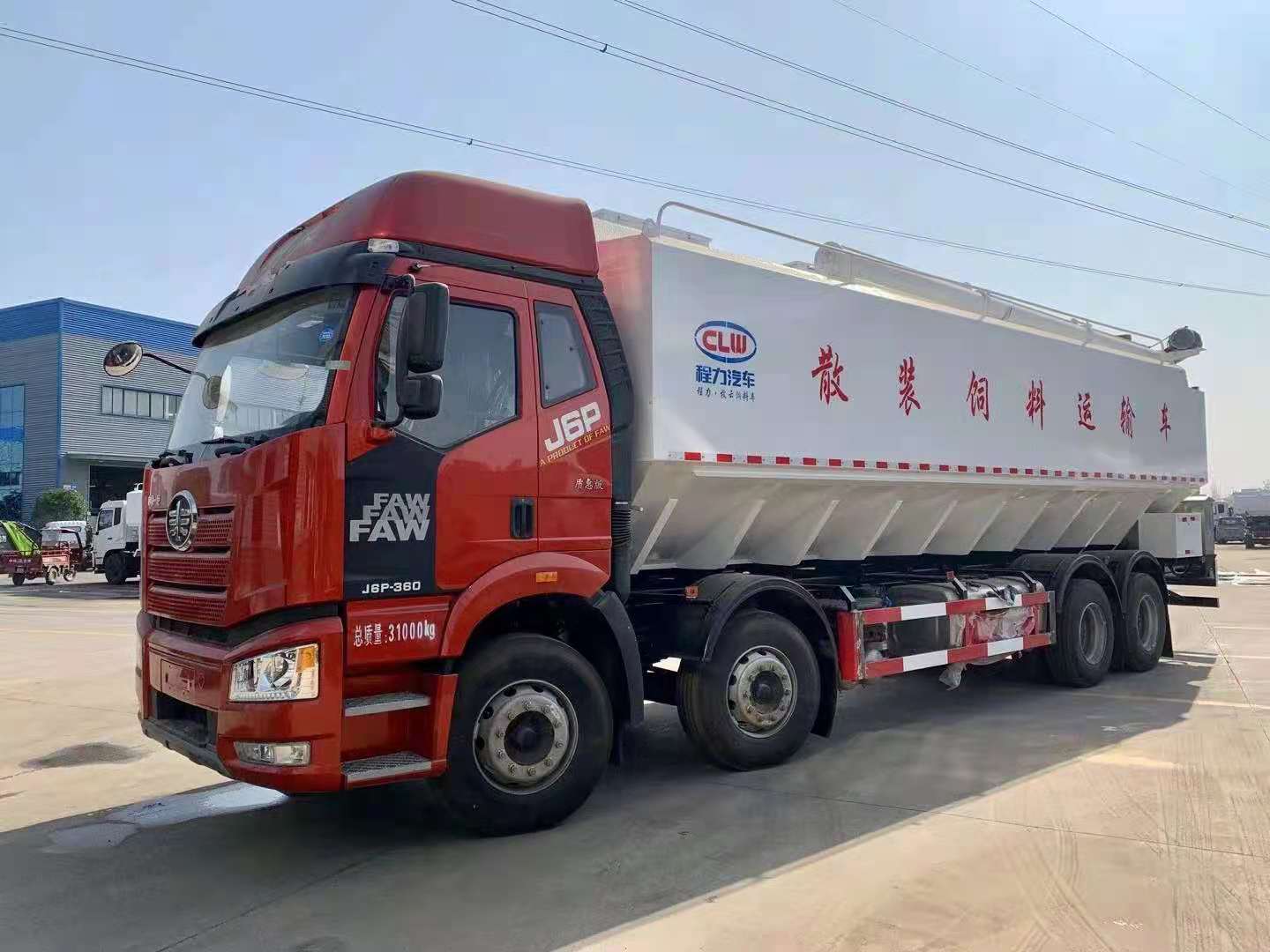 散裝飼料車(英文:bulk feed truck)是用于運(yùn)輸散裝飼料的專用車,主要用于飼料廠將生產(chǎn)出來(lái)的飼料運(yùn)輸?shù)金B(yǎng)雞場(chǎng)、養(yǎng)豬場(chǎng)等;散裝飼料車同時(shí)也可用來(lái)運(yùn)輸某些無(wú)腐蝕性粉粒狀原料,如制藥廠粉料和糧庫(kù)周轉(zhuǎn)。散裝飼料車的飼料罐架設(shè)在卡車的底盤(pán)上,罐體根據(jù)飼料種類不同可以結(jié)合用戶需求進(jìn)行分倉(cāng),罐頂開(kāi)有進(jìn)料口,頂部設(shè)有一根螺旋輸送卸料管(俗稱卸料絞龍,絞龍根據(jù)其動(dòng)力不同可以分為電動(dòng)絞龍或者液壓絞龍)則可自由旋轉(zhuǎn)和抬升。程力散裝飼料運(yùn)輸車打造行業(yè)精品,以優(yōu)良的性能和經(jīng)久耐用贏得市場(chǎng),成為國(guó)內(nèi)多家知名畜牧公司首選品牌。程力飼料車熱銷車型:東風(fēng)多利卡飼料車、東風(fēng)天錦小三軸飼料車、柳汽乘龍飼料車、東風(fēng)天龍飼料車、半掛飼料車等等。
